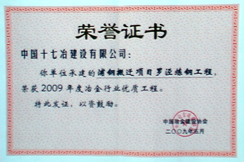 由中国十七冶承建的宝钢集团浦钢搬迁炼钢工程在中国冶金建设协会评奖中,被评为“2009年度冶金行业优质工程”。这是该项工程继荣获“全国优秀焊接工程”、上海市“申安杯”、“金钢一等奖”之后,又一次获得的奖项,为浦钢工程再添新的光彩。