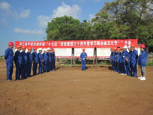 为迎接十七冶“庆祝建国六十周年暨第二届企业文化节”开幕式的到来,凝聚战斗力,鼓舞士气,8月28日上午8点58分,十七冶湛江钢铁场地平整四标项目部与总公司同步,在战斗一线举行了一场特殊而有意义的庆祝仪式。项目部全体成员通过这样一个简短的仪式来“庆祝建国六十周年暨第二届企业文化节”的开幕。