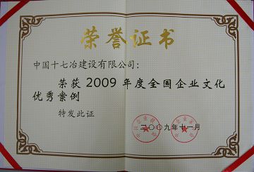 11月28日,中国企业联合会、中国企业家协会在北京召开的第八届全国企业文化年会上,十七冶荣获“2009年度全国企业文化优秀案例企业”称号,受到大会的表彰。全国政协原副主席、国务院原国务委员、中国企业联合会、中国企业家协会会长王忠禹,深圳市政协原主席、中国企业联合会、中国企业家协会常务副会长兼理事长李德成等领导为获得荣誉称号的单位授牌。 人民日报、新浪网、中国企业报、中企联合网等国内主流媒体对大会进行了报道。并对公司的企业文化优秀案例进行了集中宣传。