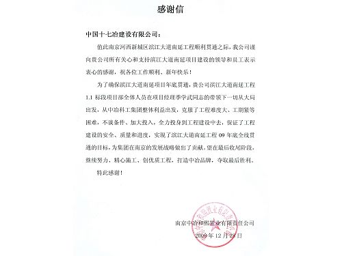 新年伊始,十七冶南京滨江大道项目部收到南京和熙置业有限责任公司感谢信,信中对我公司在确保滨江大道南延工程贯通过程中付出的努力以及作出的贡献表示感谢,全文如下: