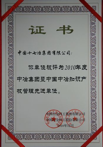 十七冶集团公司荣获中冶集团暨中国中冶“知识产权管理先进单位”称号;刘守城荣获“知识产权管理先进工作者”称号;谢兰敏荣获“科技管理先进工作者”称号。