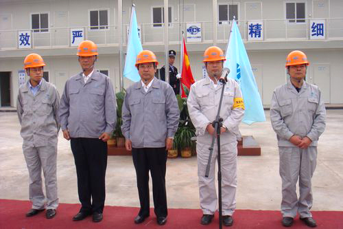 在雄壮的《义勇军进行曲》和《奉献辉煌》乐曲声中,庄严的国旗和中冶集团旗、中国十七冶集团旗徐徐升起。十七冶马钢工程项目经理部常务副经理史朝华代表项目部郑重承诺:“我们有信心,有能力,以一流的质量、一流的工期和一流的服务,圆满完成马钢工程项目建设,努力奉献精品工程!”