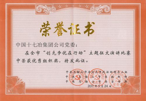近日,从马鞍山市创先争优活动领导小组获悉,中国十七冶集团党委在马鞍山市“创先争优在行动”主题征文演讲比赛中积极组织、成绩优异,荣获“优秀组织奖”。
