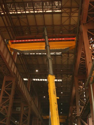 马钢新区结构调整项目钢区工程在加料跨和钢水接受跨各增加一台500/100t行车,该行车主钩设计额定起重量为500t,单梁最大吊装重量为85t。由于一期主厂房已施工完毕,受场地局限等原因,吊装难度加大。项目部工程技术人员对现场的反复勘察,精确计算,合理选择大型汽车吊进行吊装作业,确保了A梁、B梁一次吊装成功,充分展示了十七冶吊装大型设备的实力,受到了业主和相关单位的一致好评。