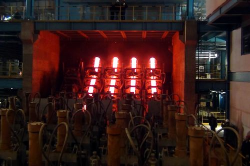 1111下午530分,精练炉被送上大包回转台,进入连铸拉坯程序。下午600,随着钢水的浇铸,圆形连铸机拉出第一组长6.4m,直径0.38m,的圆形钢坯,顿时全场沸腾。