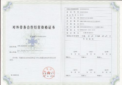近日,经过安徽省商务厅严格审批,安徽达成建筑安装工程有限公司取得了对外劳务合作经营资格证书。