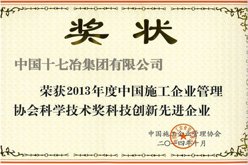 同时,公司还有2项成果获得2013年度科技创新成果奖:十七冶工程科技公司完成的《轻质自保温墙板围护结构成套技术》荣获科学技术奖科技创新成果奖一等奖;风力与太阳能发电工程技术公司完成的《海上大型测风塔施工综合技术》荣获科学技术奖科技创新成果奖二等奖。