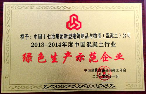 114,中国建筑协会混凝土分会授予中国十七冶集团新型建筑制品与物流(混凝土)公司为“2013-2014年度中国混凝土行业绿色生产示范企业”,并在合肥召开的表彰大会上进行了授牌。