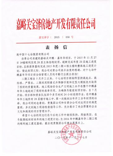 在项目1#楼顺利封顶之际,项目部收到了业主单位嘉峪关宝泽置业的表扬信。信中,宝泽置业对十七冶嘉年华项目部的辛勤付出和取得的优异成果给予了充分的肯定,并对项目部展示出来的朴实厚重的央企文化和高效的项目管理水平给予了赞扬。
