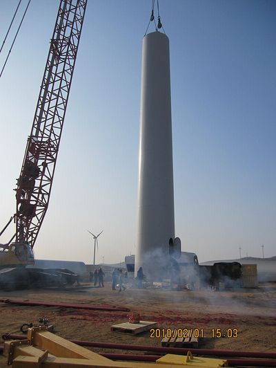 该项目施工内容包括施工道路、风机基础及十一台2MW风电机组吊装和场内输配电及通信工程,是十七冶风电工程公司第一次在蓬莱风电项目上的施工总承包。自09年12月13日开工以来,由于蓬莱地区连降大雪,施工道路被冰雪覆盖,而且坡陡路滑,挖好的基础坑被大雪填满,这一切给施工带来极大困难。为了实现对业主的承诺,经过项目部全体人员的努力拼搏,连续施工,终于抢回了大雪延误的工期,完成了土建基础工程。首台风电机组的顺利开吊,标志着此项工程进入吊装阶段。项目部全体员工决心发扬“高效严谨,精细务实”的企业作风,高效率、高品质、高服务地干好此项工程,为十七冶风电品牌的树立作出不懈努力。