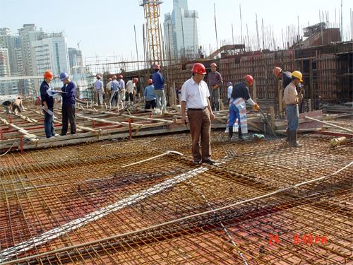 芜湖海螺大厦裙楼顶层屋面长65米、宽45米,面积达2900多平方,有宽0.8米、高1米、长27米大跨度预应力大梁8根,钢筋量217.5吨,包括墙柱在内共浇砼2600多方。裙楼结构实现封顶,标志着海螺大厦施工难度大的结构部分施工已经完成。自9月26日起,施工力量将全面进入主楼标准层作业。