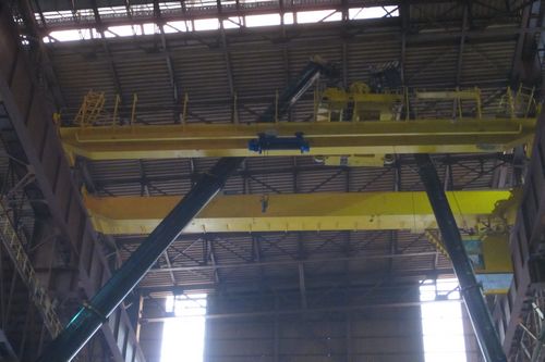 该行车桥式起重机轨道标高37.92m,J列屋面标高为46.618m,K列屋面标高为45.318m,屋架高度为2.5m,吊装与生产同时进行,行车吊装高度高、厂房空间狭小及各种介质管道的影响,给行车的吊装带来了很大困难。马钢项目与施工处精心组织,对吊车站位、回转半径、提升高度、吊臂是否卡杆进行了精确的计算,采用两台吊车相互配合进行吊装,确保50/10t行车顺利完成吊装工作,为后续的1#LF炉设备和钢结构的安装创造了条件。