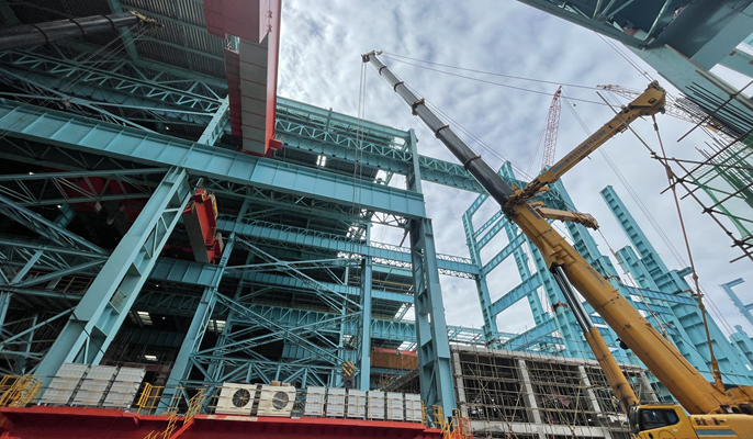 工程建设中,项目部精心组织施工力量,科学合理安排施工作业计划。在掀起大干浪潮的同时,时刻不忘“安全第一”的初衷,建立并完善项目安全早会教育管理组织与责任体系,定人、定岗、定责,为安全生产、高效施工保驾护航。截止日前,炼钢二步工程已完成高跨50米框架柱安装、18米框架梁安装、10米工艺平台铺板施工,同时配合业主单位完成加料跨第一辆280吨行车安装工作。