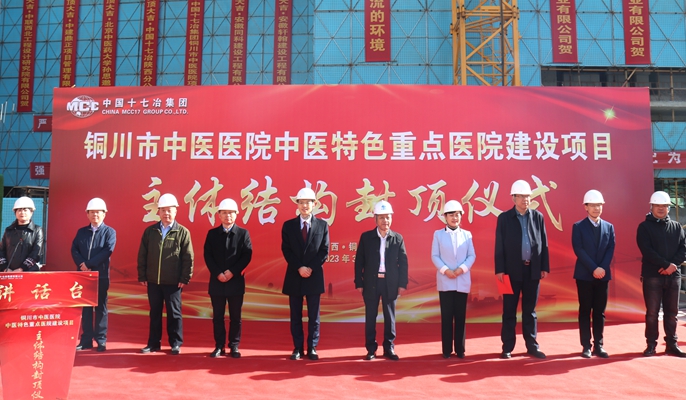 北京中医药大学孙思邈医院(铜川市中医医院)党委书记刘正军主持封顶仪式,副院长张淑玲、张武平、毛玮、刘晓铮,院长助理、甲状腺病院院长祁烁,总会计师胡燕华,中冶陕投公司总工程师,陕西分公司副经理丁守明,中建鼎正项目管理有限公司经理靳海峰、总工程师闫济洲及医务工作者、生产建设单位代表共计60余人参加了封顶仪式。