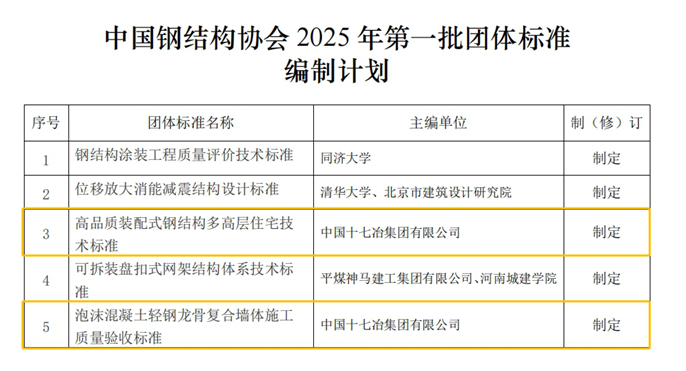 5月13日,中国钢结构协会印发了《关于发布中国钢结构协会2025年第一批团体标准编制计划的通知》,中国十七冶牵头制定的两项装配式钢结构方面的团体标准《高品质装配式钢结构多高层住宅技术标准》、《泡沫混凝土轻钢龙骨复合墙体施工质量验收标准》成功获批立项。