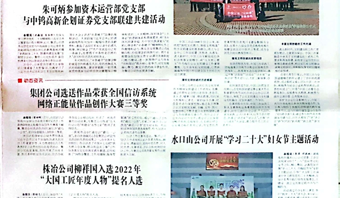 3月21日,中国五矿主办的《中国五矿报》3版党建综合以《集团公司选送作品荣获全国信访系统网络正能量作品创作大赛三等奖》为题,对中国十七冶报送作品在全国信访系统作品创作大赛中获评三等奖进行报道。