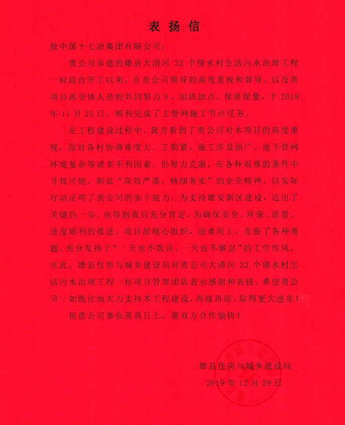 1月8日,河北省雄县住房与城乡建设局发来表扬信,对中国十七冶集团交通工程技术分公司承建的雄县大清河32个傍水村生活污水治理项目顺利完成主管网施工任务予以大加赞扬,对公司领导的高度重视及项目部全体人员的辛勤付出给予了充分肯定和认可。