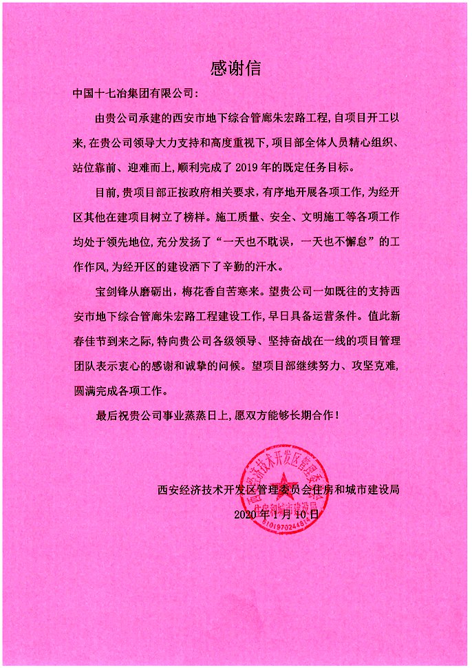 1月10日,西安市经济技术开发区住房与城市建设局向中国十七冶集团发来感谢信,对西安管廊朱宏路工程项目部顺利完成2019年既定建设任务和积极配合管委会推进工程建设表示感谢。