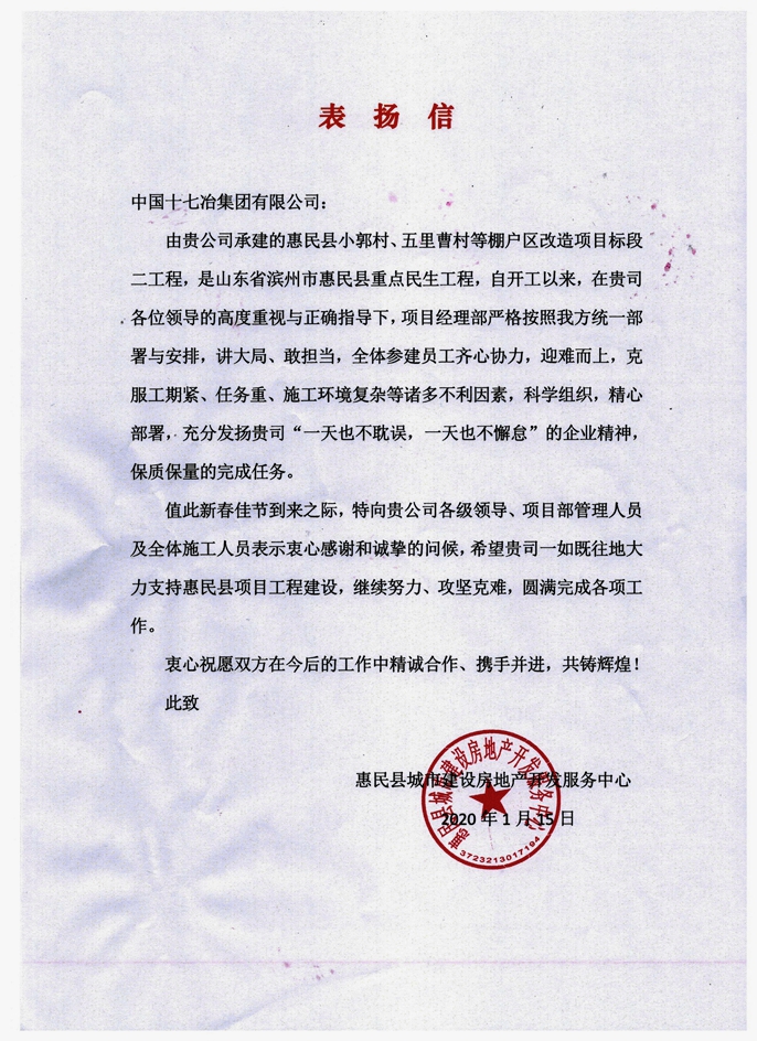 1月15日,山东省滨州市惠民县城市建设房地产开发服务中心向中国十七冶集团发来表扬信,对十七冶承建的小郭村、五里曹村等棚户区改造项目标段二工程保质保量完成任务提出表扬,同时在新春来临之际对十七冶各级领导及全体管理人员表示衷心感谢和诚挚问候。