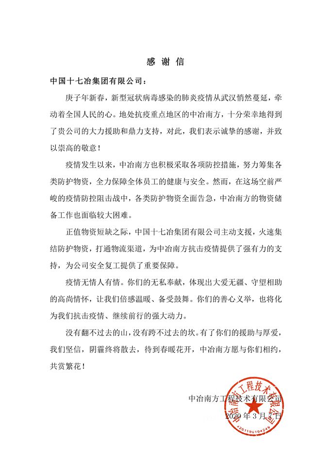 3月7日,中冶南方工程技术有限公司向中国十七冶集团有限公司发来感谢信。