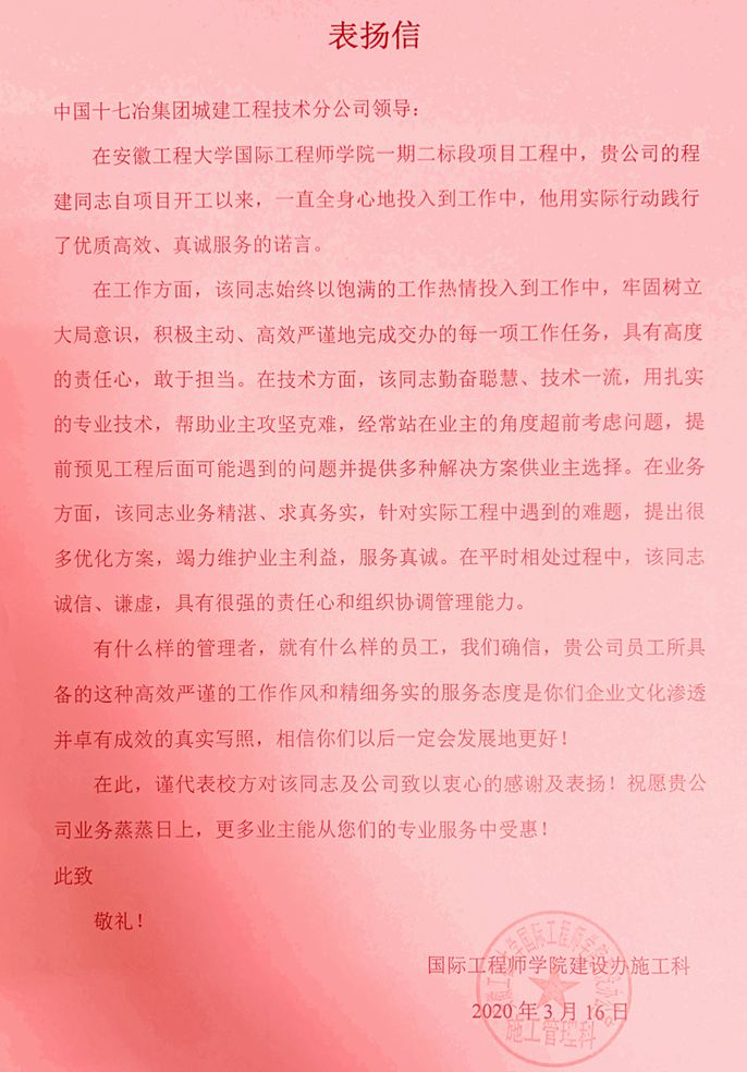 3月26日,中国十七冶集团城建工程技术分公司收到安徽工程大学国际工程师学院建设办施工科发来的表扬信,表扬项目部程建同志工作积极主动,敢于担当,高效严谨推进工程建设,赢得了各方认可。