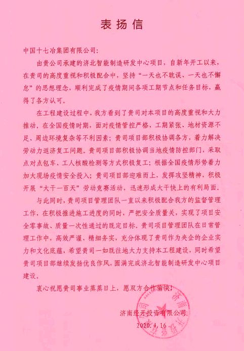 4月20日,中国十七冶集团收到济南经开投资有限公司发来的表扬信,表扬山东分公司济北智能制造研发中心项目部高度重视、积极配合,顺利完成了疫情期间各项工期节点和任务目标,赢得了各方认可。