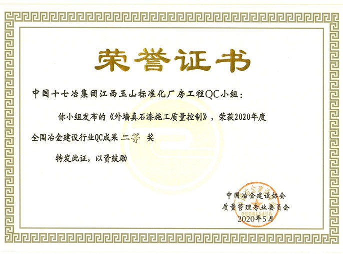 7月3日,中国十七冶集团江西玉山标准化厂房工程QC小组撰写发布的《外墙真石漆施工质量控制》QC成果获评2020年度全国冶金建设行业QC成果二等奖。