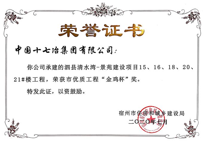 7月10日和14日,中国十七冶集团承建的泗县人民医院新院项目和清水湾景苑建设项目荣获宿州市优质工程“金鸡杯”奖。
