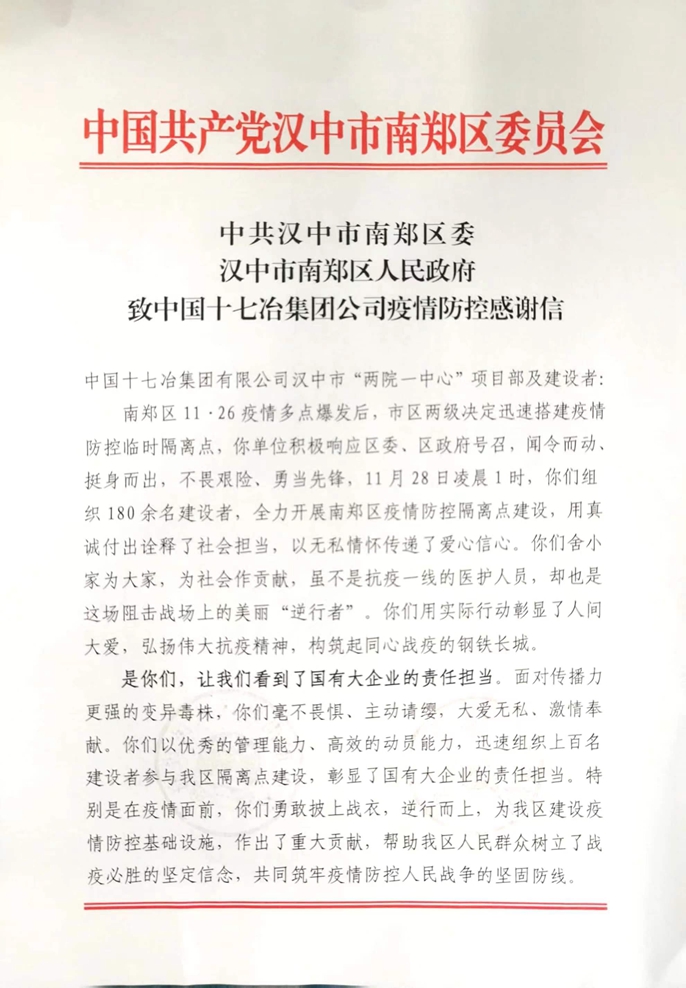 近日,汉中市南郑区委、区人民政府向中国十七冶集团致感谢信,对陕西分公司汉中市“两院一中心”项目团队在2022年南郑区疫情“阻击战”中的艰苦付出给予充分肯定并致以衷心感谢。
