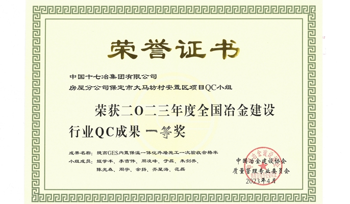 中国十七冶13项QC成果获全国冶金建设行业一等奖等荣誉