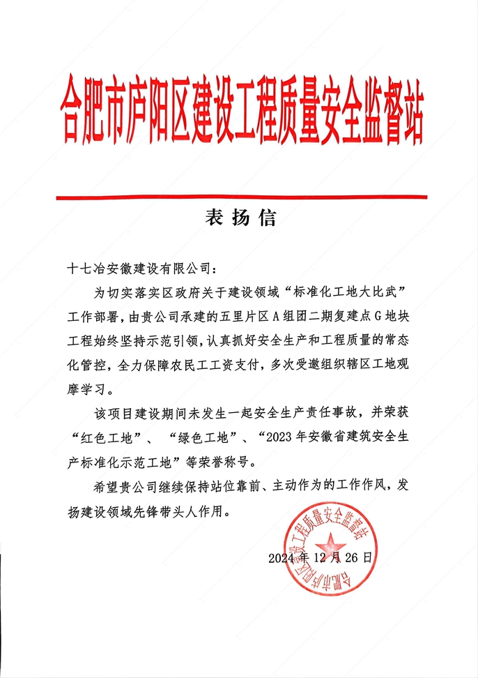 12月26日,合肥市庐阳区建设工程质量安全监督站向十七冶安徽建设有限公司致表扬信,对合肥五里片区A组团二期G地块项目团队精益管理,保障项目顺利推进提出表扬。