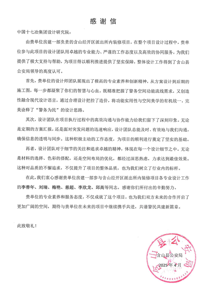 近日,马鞍山市含山县公安局向中国十七冶设计研究院致感谢信,对设计团队在含山经开区派出所内装修项目工作中提供的优质设计服务予以肯定与感谢。