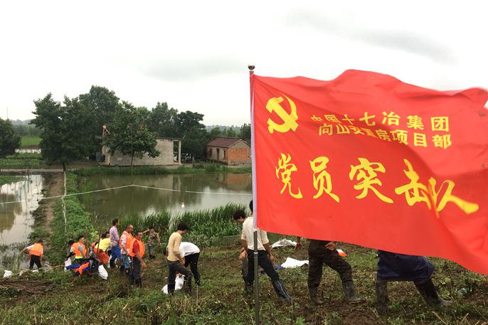 在抢险现场,当党旗立下的那一刻,全体抢险人员齐心协力、分工协作,面对雨中湍急的长江水流,水位即将高过的地面,抢险队员们不怕苦不怕累,踩着稀泥乱石,深一脚浅一脚地走在堤坝上,拿起编织袋、铁秋,装砂石的装砂石,运沙袋的运沙袋,积极投身到抗洪抢险中。
