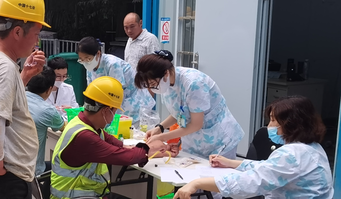 6月29日上午,中国十七冶集团山东分公司青岛市湛山广场人员掩蔽项目、新湛三路9号住宅拆除重建项目联合湛山社区卫生服务站为一线作业工人进行免费健康检查。