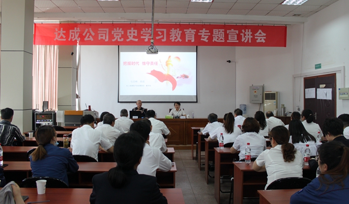 为深入开展党史学习教育,切实提升党员干部党性修养,5月27日下午,达成公司党委召开了党史学习教育专题宣讲会。公司全体党员和各级非党员管理人员50余人参加了学习。