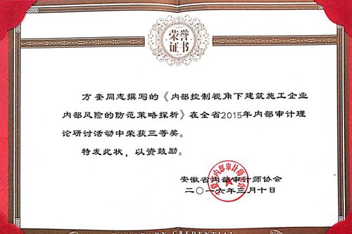 日前,从安徽省内部审计师协会获悉,中国十七冶集团城建工程技术公司员工方奎同志撰写的论文《内部控制视角下建筑施工企业内部风险的防范策略探析》荣获安徽省内部审计师协会开展的“全省2015年内部审计理论研讨活动”三等奖。