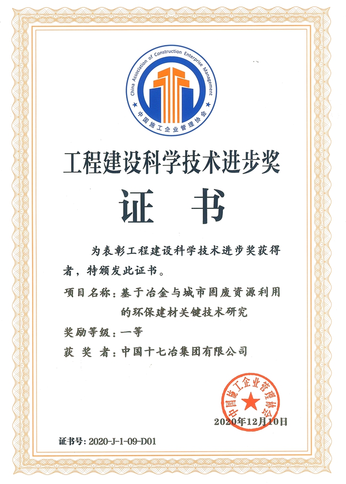 12月11日,中国施工企业管理协会在北京召开2020年工程建设科学技术奖励大会。中国十七冶集团《基于冶金与城市固废资源利用的环保建材关键技术研究》荣获科学技术进步一等奖,这是公司12月份获得的第4项省部级科技一等奖。近期以来,公司技术成果《高延性水泥基复合材料及高性能结构关键技术研究与应用》获中冶集团科技进步一等奖,《基于固废资源化的高性能泡沫混凝土制备与轻钢组合墙体关键技术》获中国五矿集团科技进步一等奖,《基于固废资源化的高性能泡沫混凝土关键技术与应用》获国家建筑材料工业技术情报研究所建筑材料创新奖一等奖。至此,公司累计获得省部级科技一等奖突破两位数,科技创新再迈新台阶。