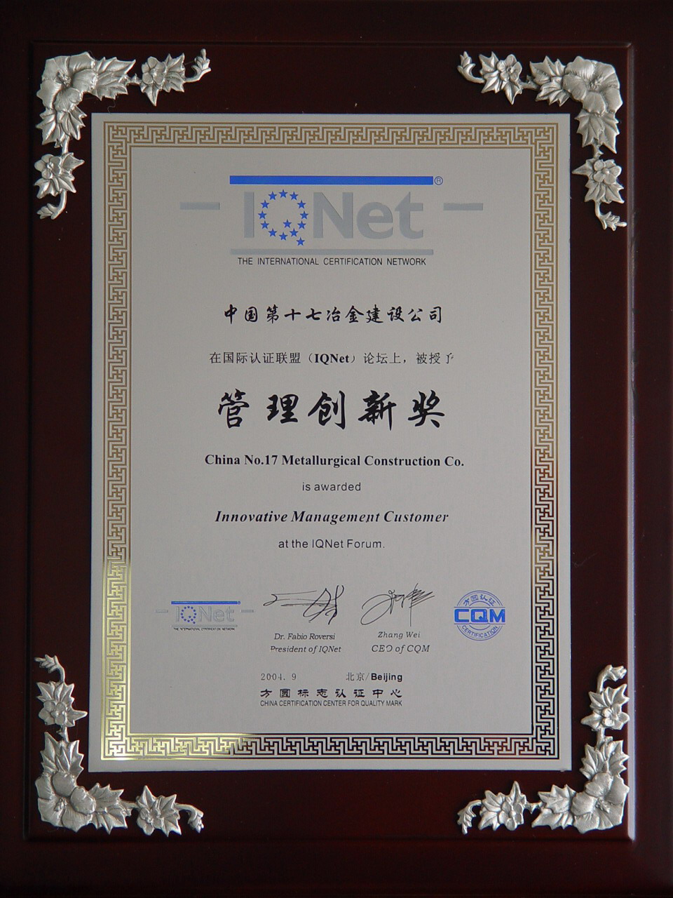 日前,在北京召开的国际认证联盟(IQNet)论坛会议上,中国十七冶以质量管理的创新和持续改进、现场改观、质量提升的优秀业绩,被授予管理创新奖,国家认监委、标委领导、国际认证联盟IQNet主席和IQNet秘书长为获奖单位颁奖。十七冶总工程师汤惠群、十七冶经济发展部副经理杨敏军参加了会议。