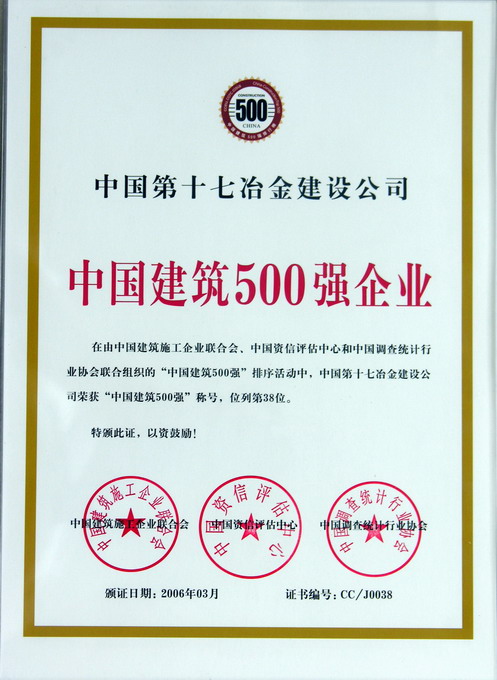 记者日前从有关方面获悉:在由中国建筑施工企业联合会、中国资信评估中心和中国调查统计行业协会联合组织的“中国建筑500强”排序活动中,中国第十七冶金建设公司荣获“中国建筑500强企业”称号,位列第38位。