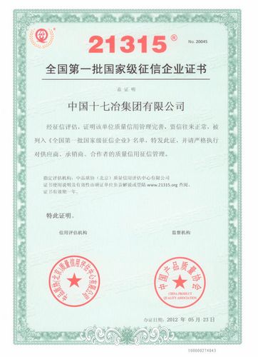 中国十七冶集团顺利通过中国产品质量协会关于国家级企业信用等级的复审,继续保持了“全国第一批国家级征信企业”荣誉称号,并同时荣获“