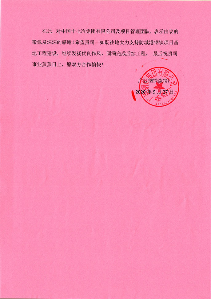 9月27日,广西钢铁炼钢厂向中国十七冶集团致表扬信,高度评价冶金分公司防城港钢铁炼钢项目管理团队在施工过程中落实措施保安全、严管施工保质量、统筹组织保进度,彰显过硬的作风及专业的水准,为其他参建单位树立了很好的标杆。