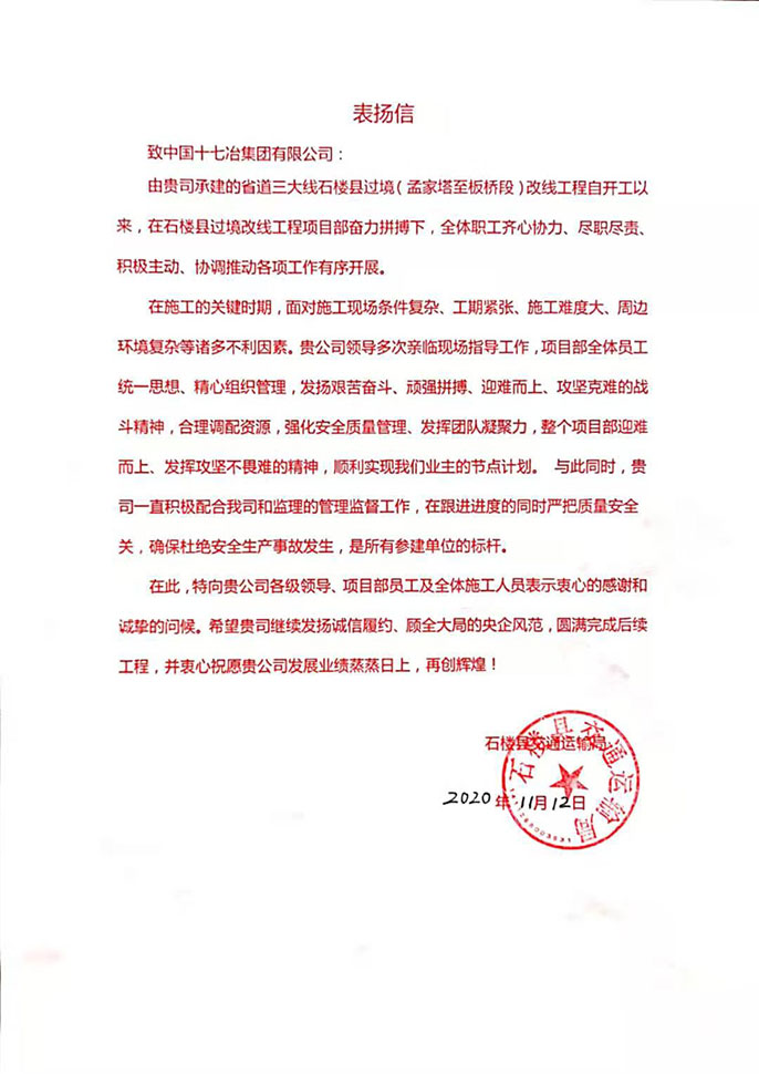 11月12日,山西省石楼县交通运输局向中国十七冶集团致表扬信,对市政工程技术分公司石楼县过境改线工程项目部诚信履约、高效施工提出表扬。
