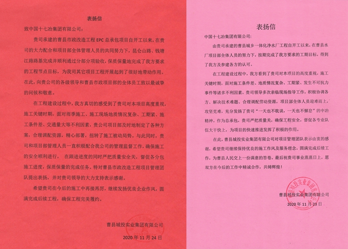 11月23日和24日,曹县城投实业集团有限公司向中国十七冶集团致表扬信,对中国十七冶集团承建的曹县城乡供水一体化净水厂和曹县市政改造工程EPC总承包项目昆仑山路工程、钱塘江路工程施工提出高度赞扬。