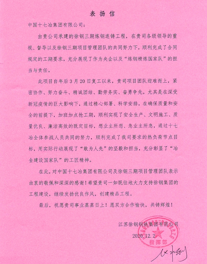 12月2日,中国十七冶集团收到来自江苏徐钢钢铁集团发来的表扬信,对冶金工程技术分公司承建的徐钢三期炼钢连铸工程项目管理团队的努力拼搏和辛勤劳作表示赞扬与感谢。