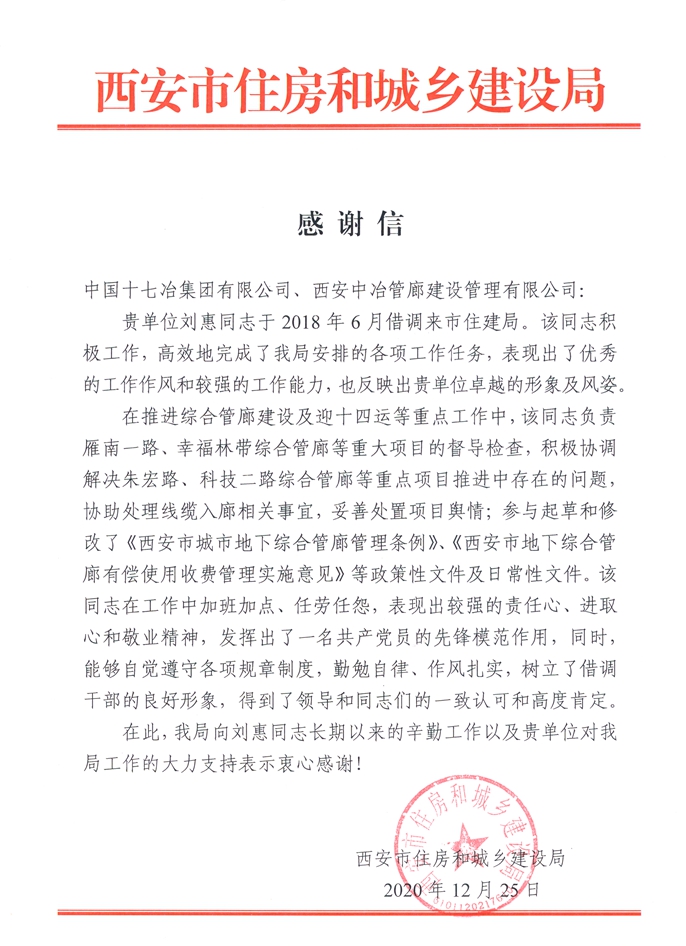 12月25日,西安市住房和城乡建设局向中国十七冶集团公司发出感谢信,对十七冶陕西分公司员工刘惠同志长期以来的辛勤工作以及十七冶集团对住建局工作的大力支持表示衷心感谢。