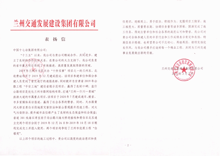 2月2日,兰州交通发展建设集团有限公司向中国十七冶集团有限公司发来表扬信,对十七冶公路分公司承建的兰州四个项目的突出表现给予肯定与表扬。