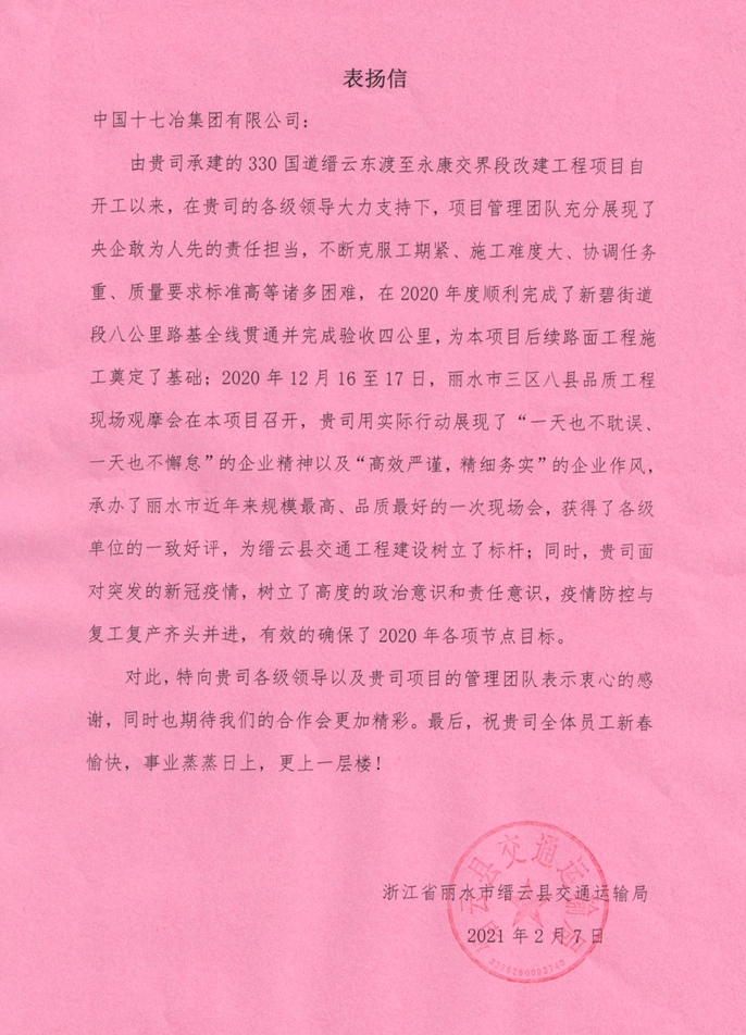 2月7日,浙江缙云县交通运输局向中国十七冶集团致表扬信,对路桥工程技术分公司浙江330国道缙云东渡至永康交界段改建工程项目部诚信履约,优质建设给予表扬并表示感谢。