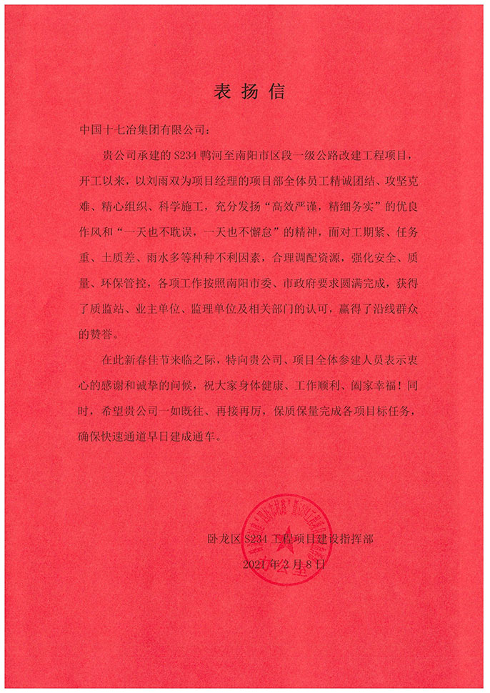 2月8日,河南省南阳市卧龙区S234工程项目建设指挥部向中国十七冶集团致表扬信,对路桥工程技术分公司S231(新S234)鸭河工区至南阳市区段一级公路改建工程项目部攻坚克难,圆满完成南阳市委、市政府的各项工作任务提出表扬并表示感谢。