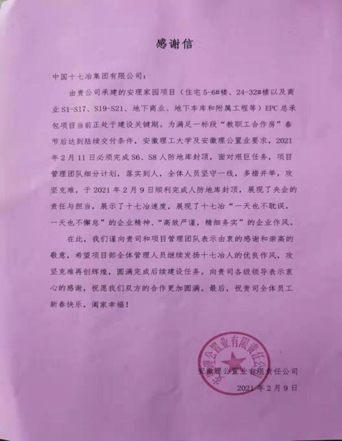 2月9日,安徽理公置业有限责任公司致信中国十七冶集团,对中国十七冶集团及安理家园项目管理团队表示感谢。