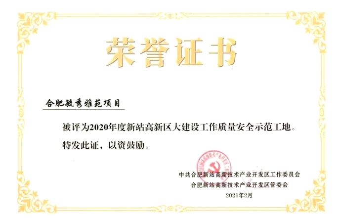 2月27日,在合肥新站高新区大建设工作表彰大会上,中国十七冶集团承建的毓秀雅苑项目获评“质量安全示范工地”荣誉称号。